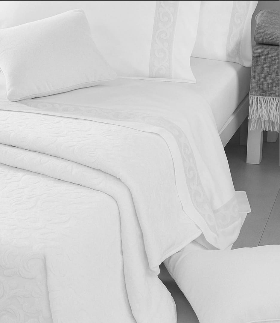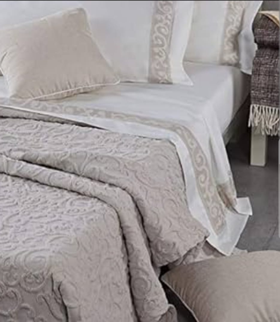 Elegante e raffinato copriletto in puro cotone jacquard in rilievo. La coperta S.Marco si adatta in uno stile minimal dai toni naturali e sobri. Il brand Mirabello è garanzia di prodotti di qualità.